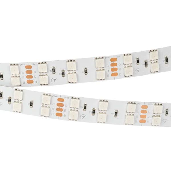 Широкая двухрядная мультицветная лента RT серии B120, шириной 15 мм с RGB светодиодами SMD 5060 (120 шт/м). Мощность 28.8 Вт/м, напряжение питания 24 В. Предназначена для оформления клубов, залов, ресторанов. Создания световых линий с изменяемым цветом свечения. Подходит для помещений с высокими потолками. Управляется RGB-контроллером. Минимальный отрезок 50 мм (6 светодиодов). Обязательна установка на алюминиевый профиль.