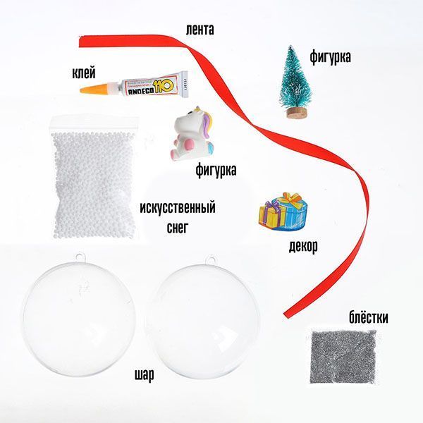В наборе: ёлочный шар-основа, фигурки, гирлянда, декор.
