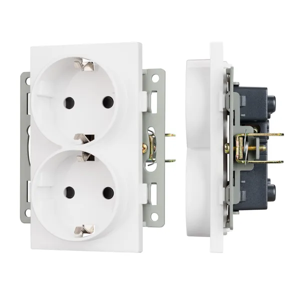 Механизм сдвоенной розетки с заземлением на 2 поста, совместим с рамками вертикального ориентирования монтажа серий VERSA/GLARE/PRESTO. Накладной тип монтажа позволяет с легкостью произвести монтаж/замену. Видимая часть механизма выполнена из высококачественного тугоплавкого пластика белого цвета. Контактная часть присоединяется при помощи винтовых зажимов, а усиленные монтажные лапки надежно фиксируют механизм в установочном подрозетнике.