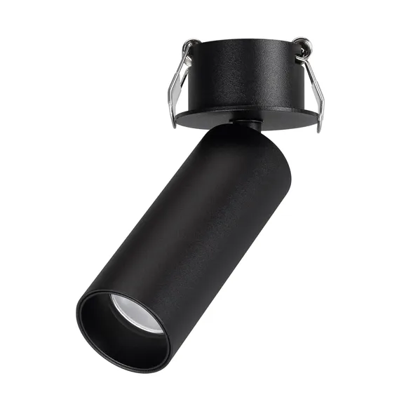 Светильник встраиваемый откидной. Мощность 7 Вт, св. поток 580 лм, 82 лм/Вт, дневной 4000 K, CRI>90, угол 36°, напряжение питания 230 В. Черный круглый корпус из алюминия, экран PMMA, степень защиты IP40. Размер: диаметр 35 мм, высота светового модуля 90 мм, высота основания 1.5 мм. Угол поворота 350°, угол наклона 90°. Монтаж встраиваемый, установочное отверстие: диаметр 45 мм, глубина 29 мм. Драйвер в комплекте 30-40 В, 150 мA, пульсация <1%.