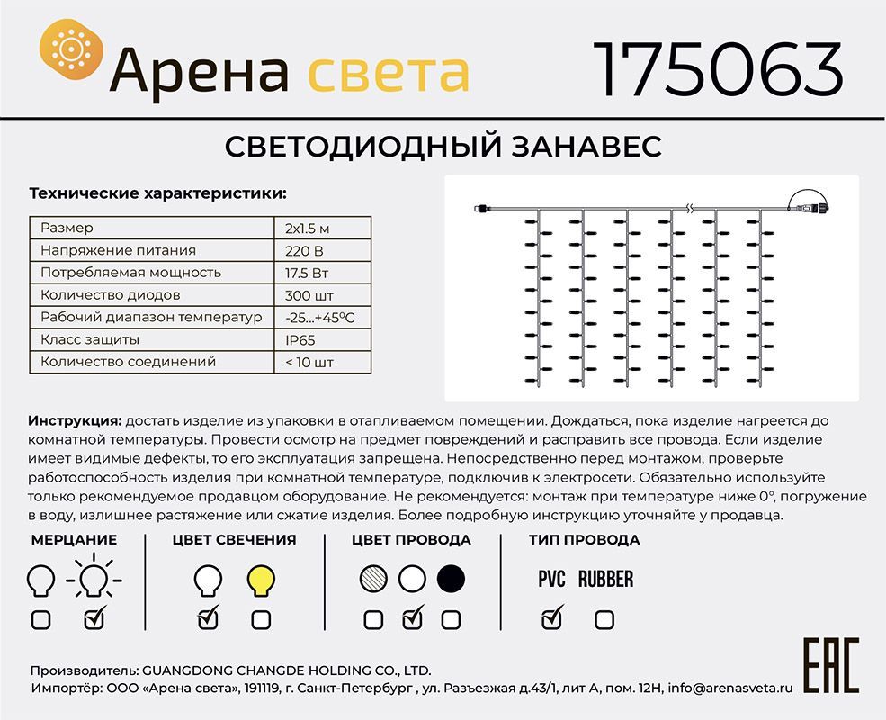 гирлянда ЗАНАВЕС 17.5W Белый Арена Света белый провод ПВХ, облегченный, с мерцанием 2*1.5 м. 220V, 300 Led, IP65