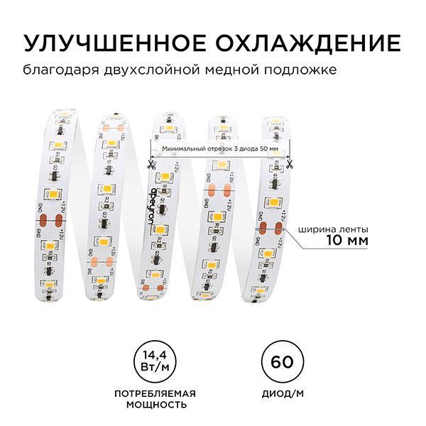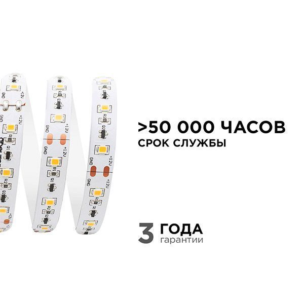 Светодиодная лента из линейки Стандарт с артикулом 00-11 работает от постоянного тока с напряжением 12В. Благодаря светодиодам smd 5050 излучающим световой поток равный 700 Лм/м лента является прекрасным решением для организации основного освещения и ярких декоративных подсветок. Она подойдет для создания основного освещения на базе многоуровневых потолков, а также будет отличным выбором для освещения торгового оборудования или требующих большой яркости рекламных вывесок. По сравнению с лампами накаливания светодиодная лента эквивалентна лампам мощностью 70 Вт. Данная модель светодиодной ленты обладает теплым белым цветом свечения с цветовой температурой 3000 К. При выборе светодиодной ленты важно учитывать такой параметр, как потребляемая мощность, чтобы правильно подобрать блок питания. У данной модели этот показатель равен 14,4 Вт на один метр. Степень защиты этого изделия соответствует стандарту IP65, что позволяет использование не только во влажных помещениях, но и на улице. Отрезать светодиодную ленту можно в специально отмеченных местах, которые располагаются через каждые 50 мм. Компактные размеры светодиодной ленты с шириной 10 мм и основанием из гибкой, двухслойной, медной подложки дают огромное преимущество при создании любых дизайнерских фантазий. Для управления лентой используйте диммер для монохромной светодиодной ленты (приобретается дополнительно). С помощью него можно включать или выключать светодиодную ленту, отрегулировать ее яркость, а также использовать различные динамические режимы и настроить скорость их работы.