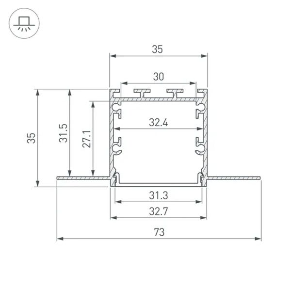Алюминиевый светотехнический профиль для установки светодиодной ленты или линейки. Цвет серебристый. Длина 3000 мм, размер сечения 73х35 мм. Монтаж осуществляется встраиваемым способом. Фланцы закрашиваются, что позволяет скрыть алюминиевые части профиля, в результате видна только световая линия. Рассеиваемая тепловая мощность 46 Вт/м позволяет подобрать источник света как для основного освещения, так и для мягкой декоративной подсветки.