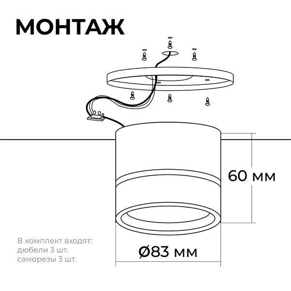 Размер светильника O83х60 мм. Степень пылевлагозащиты IP20, рекомендуется для установки в сухих, проветриваемых помещениях. Работает от сети 230 В.