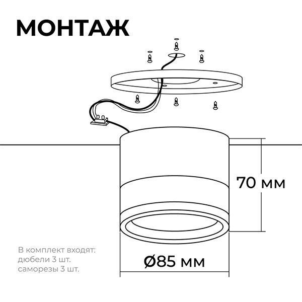 Размер светильника O85х70 мм. Степень пылевлагозащиты IP20, рекомендуется для установки в сухих, проветриваемых помещениях. Работает от сети 230 В.