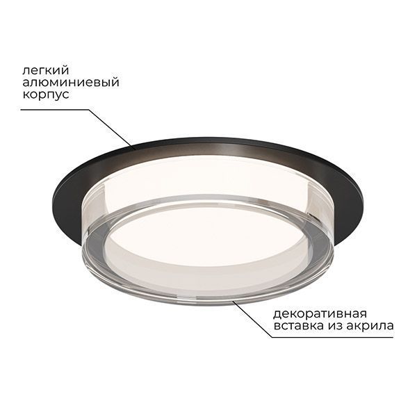 Цвет изделия – черный. Прочный, легкий корпус выполнен из алюминия с декоративными вставками из акрила. Размер светильника O105х42 мм, врезное отверстие O95 мм. Степень пылевлагозащиты IP20, рекомендуется для установки в сухих, проветриваемых помещениях. Работает от сети 230 В.