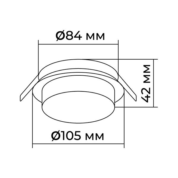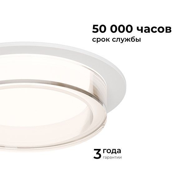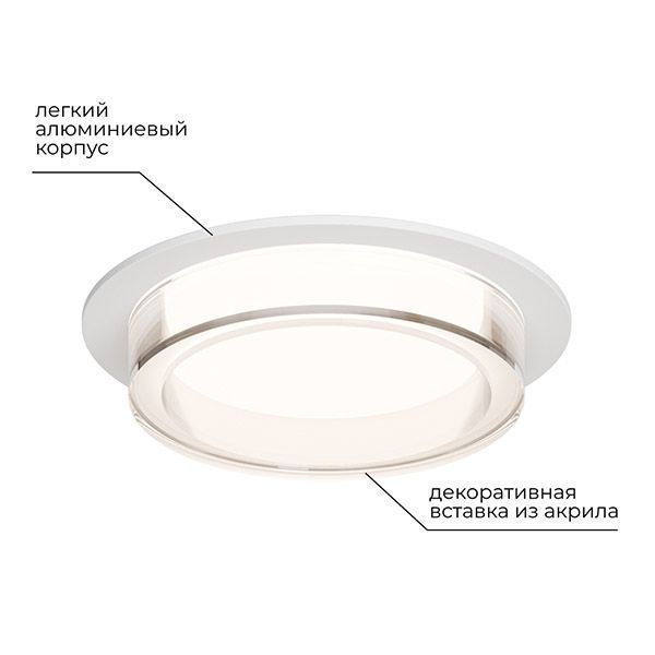 Цвет изделия – белый. Прочный, легкий корпус выполнен из алюминия с декоративными вставками из акрила. Размер светильника O105х42 мм, врезное отверстие O95 мм. Степень пылевлагозащиты IP20, рекомендуется для установки в сухих, проветриваемых помещениях. Работает от сети 230 В.