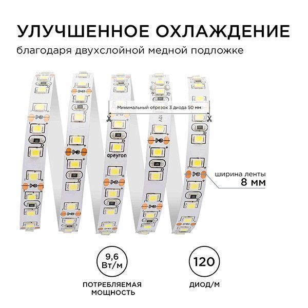 Светодиодная лента из линейки Стандарт с артикулом 00-31 работает от постоянного тока с напряжением 12В. Благодаря светодиодам smd 3528 излучающим световой поток равный 600 Лм/м лента является прекрасным решением, для воплощения в жизнь такого элемента оформления, как декоративная подсветка. Она подойдет для декорирования ниш в стенах, многоуровневых потолков и даже мебели. По сравнению с лампами накаливания светодиодная лента эквивалентна лампам мощностью 60 Вт. Данная модель светодиодной ленты обладает холодным белым цветом свечения с цветовой температурой 6500 К. При выборе светодиодной ленты важно учитывать такой параметр, как потребляемая мощность, чтобы правильно подобрать блок питания. У данной модели этот показатель равен 9,6 Вт на один метр. Степень защиты этого изделия соответствует стандарту IP20, что подразумевает использование только в сухих и проветриваемых помещениях. Отрезать светодиодную ленту можно в специально отмеченных местах, которые располагаются через каждые 25 мм. Компактные размеры светодиодной ленты с шириной 8 мм и основанием из гибкой, двухслойной, медной подложки дают огромное преимущество при создании любых дизайнерских фантазий. Для управления лентой используйте диммер для монохромной светодиодной ленты (приобретается дополнительно). С помощью него можно включать или выключать светодиодную ленту, отрегулировать ее яркость, а также использовать различные динамические режимы и настроить скорость их работы.