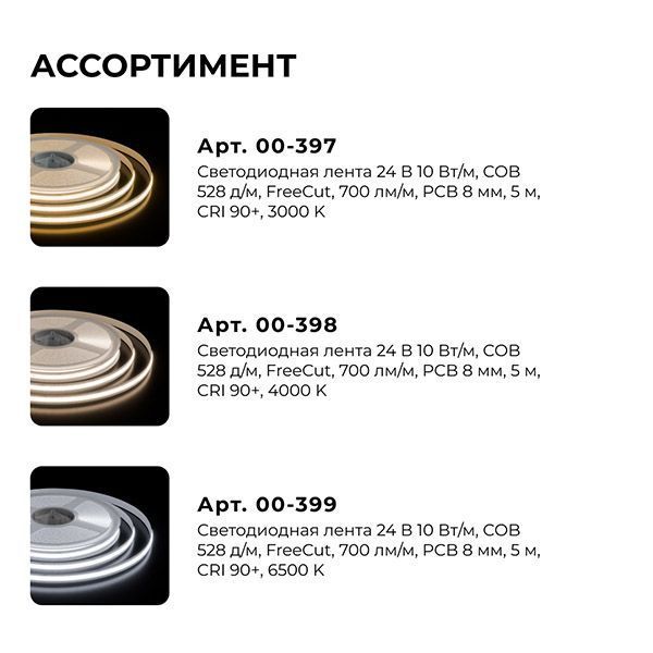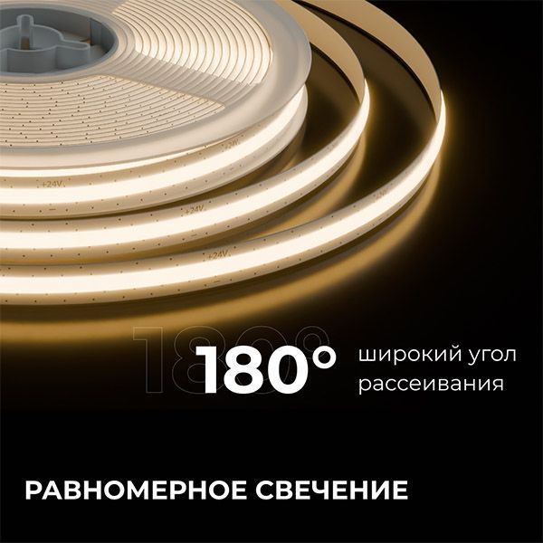 Сверхъяркая светодиодная лента COB 00-397 из линейки ПРО со свободным резом (FreeCut) работает от постоянного тока с напряжением 24 В. Благодаря светодиодам COB плотностью 528 шт./м и световым потоком 700 лм/м лента позволяет создавать идеальную сплошную линию света без применения рассеивателя.