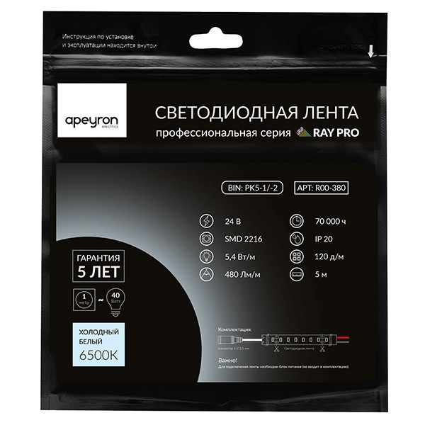 Светодиодная лента из линейки PRO с артикулом R00-380 работает от постоянного тока с напряжением 24В. Благодаря светодиодам smd2216, излучающим световой поток равный 480 Лм/м лента является прекрасным решением, для воплощения в жизнь такого элемента оформления, как декоративная подсветка. Она подойдет для декорирования ниш в стенах, многоуровневых потолков и даже мебели. Для улучшенного теплоотвода устанавливайте ленту в алюминиевый профиль. По сравнению с лампами накаливания данная лента эквивалентна лампам мощностью 50 Вт. Данная модель светодиодной ленты обладает холодным белым цветом свечения с цветовой температурой 6500 К. При выборе светодиодной ленты важно учитывать такой параметр, как потребляемая мощность, чтобы правильно подобрать блок питания 24 В. У данной модели этот показатель равен 5,4 Вт на один метр. Степень защиты этого изделия соответствует стандарту IP20, что подразумевает использование только в сухих и проветриваемых помещениях. Отрезать светодиодную ленту можно в специально отмеченных местах, которые располагаются через каждые 50 мм. Компактные размеры светодиодной ленты с шириной 4 мм и основанием из гибкой, двухслойной, медной подложки дают огромное преимущество при создании любых дизайнерских фантазий. Для управления монохромной светодиодной лентой используйте диммер (приобретается дополнительно). С помощью него можно включать или выключать светодиодную ленту, отрегулировать ее яркость, а также использовать различные динамические режимы и настроить скорость их работы.