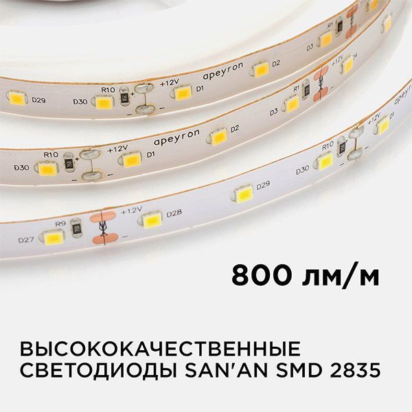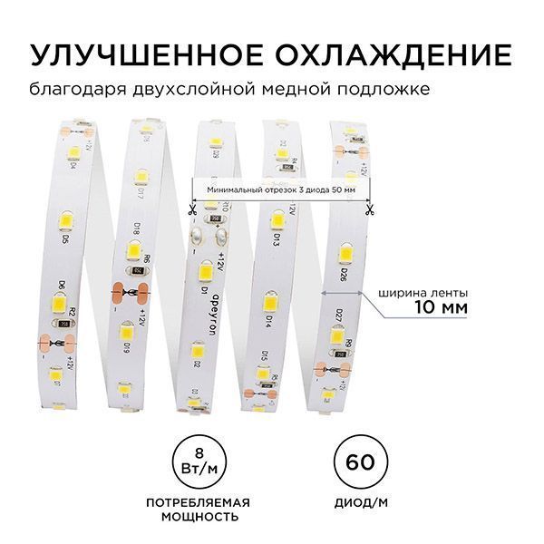 Светодиодная лента из линейки Стандарт с артикулом 00-120 работает от постоянного тока с напряжением 12В. Благодаря светодиодам smd 2835 излучающим световой поток равный 800 Лм/м лента является прекрасным решением для организации основного освещения и ярких декоративных подсветок. Она подойдет для создания основного освещения на базе многоуровневых потолков, а также будет отличным выбором для освещения торгового оборудования или требующих большой яркости рекламных вывесок. По сравнению с лампами накаливания светодиодная лента эквивалентна лампам мощностью 80 Вт. Данная модель светодиодной ленты обладает теплым белым цветом свечения с цветовой температурой 3000 К. При выборе светодиодной ленты важно учитывать такой параметр, как потребляемая мощность, чтобы правильно подобрать блок питания. У данной модели этот показатель равен 8 Вт на один метр. Степень защиты этого изделия соответствует стандарту IP20, что подразумевает использование только в сухих и проветриваемых помещениях. Отрезать светодиодную ленту можно в специально отмеченных местах, которые располагаются через каждые 50 мм. Компактные размеры светодиодной ленты с шириной 10 мм и основанием из гибкой, двухслойной, медной подложки дают огромное преимущество при создании любых дизайнерских фантазий. Для управления лентой используйте диммер для монохромной светодиодной ленты (приобретается дополнительно). С помощью него можно включать или выключать светодиодную ленту, отрегулировать ее яркость, а также использовать различные динамические режимы и настроить скорость их работы.