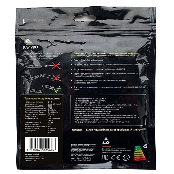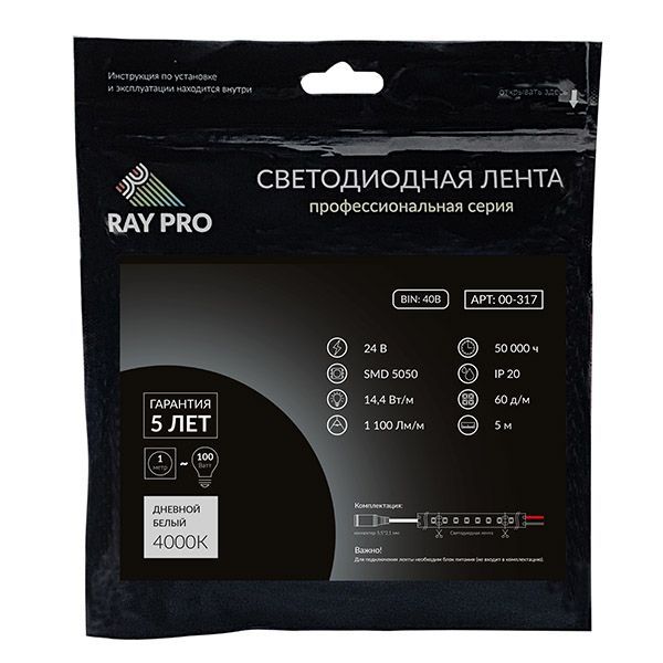 Светодиодная лента из линейки PRO с артикулом 00-317 работает от постоянного тока с напряжением 24В. Благодаря светодиодам smd5050 излучающим световой поток равный 1100 Лм/м лента является прекрасным решением для организации основного освещения и ярких декоративных подсветок. Она подойдет для создания основного освещения на базе многоуровневых потолков, а также будет отличным выбором для освещения торгового оборудования или требующих большой яркости рекламных вывесок. По сравнению с лампами накаливания светодиодная лента эквивалентна лампам мощностью 110 Вт. Данная модель светодиодной ленты обладает дневным белым цветом свечения с цветовой температурой 4000 К. При выборе светодиодной ленты важно учитывать такой параметр, как потребляемая мощность, чтобы правильно подобрать блок питания. У данной модели этот показатель равен 14,4 Вт на один метр. Степень защиты этого изделия соответствует стандарту IP20, что подразумевает использование только в сухих и проветриваемых помещениях. Отрезать светодиодную ленту можно в специально отмеченных местах, которые располагаются через каждые 100 мм. Компактные размеры светодиодной ленты с шириной 10 мм и основанием из гибкой, двухслойной, медной подложки дают огромное преимущество при создании любых дизайнерских фантазий. Для управления лентой используйте диммер для монохромной светодиодной ленты (приобретается дополнительно). С помощью него можно включать или выключать светодиодную ленту, отрегулировать ее яркость, а также использовать различные динамические режимы и настроить скорость их работы.