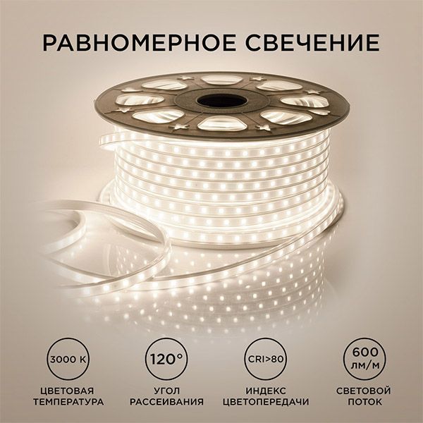 Светодиодная лента из линейки стандарт с артикулом 10-63 работает от постоянного тока с напряжением 220В, цвет свечения: белый теплый, цветовая температура: 3000 К. Подойдет для декорирования нежилых помещений, беседок, уличных конструкций, благодаря светодиодам smd 2835 излучающим световой поток равный 600 Лм/м* и компактным размерам (ширина 11 мм). LED лента эквивалентна лампам накаливания мощностью 60 Вт.. При выборе важно учитывать такой параметр, как потребляемая мощность, чтобы правильно подобрать шнур питания. У данной модели этот показатель равен 6 Вт на один метр. Степень защиты соответствует стандарту IP65, что позволяет использование не только во влажных помещениях, но и на улице. Отрезать изделие можно в специально отмеченных местах, которые располагаются через каждый 1 м.