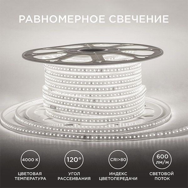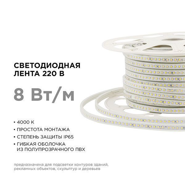 Светодиодная лента 220 В из линейки Стандарт с артикулом 17-40 используется для внутреннего и наружного декоративного освещения. Предназначена для подсветки рекламных конструкций, освещения торговых помещений, подсветки контуров зданий и витрин, создания световых фигур. Светодиодная лента помещена в ПВХ-оболочку с полупрозрачным рассеивателем и имеет размер 13,5х7 мм. Данная модель светодиодной ленты обладает дневным белым цветом свечения с цветовой температурой 4000 К. Длина изделия 50 м. Отрезать светодиодную ленту можно в специально отмеченных местах, которые располагаются через каждый 1 м. Степень защиты соответствует стандарту IP65, что позволяет использование не только во влажных помещениях, но и на улице. Подключение к сети 230 В осуществляется при помощи шнура питания с диодным мостом (приобретается отдельно).
