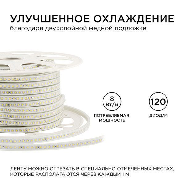 Светодиодная лента Белый дневной 2835 220V 8W/m 120Led/м герм 17-40 Стандарт IP65 50М