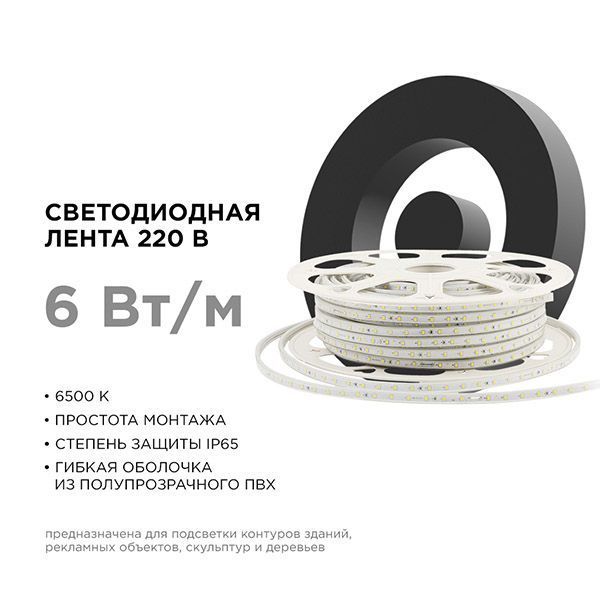 Светодиодная лента 220 В из линейки Стандарт с артикулом 17-42 используется для внутреннего и наружного декоративного освещения. Предназначена для подсветки рекламных конструкций, освещения торговых помещений, подсветки контуров зданий и витрин, создания световых фигур. Светодиодная лента помещена в ПВХ-оболочку с полупрозрачным рассеивателем и имеет размер 10х7 мм. Данная модель светодиодной ленты обладает холодным белым цветом свечения с цветовой температурой 6500 К. Длина изделия 50 м. Отрезать светодиодную ленту можно в специально отмеченных местах, которые располагаются через каждый 1 м. Степень защиты соответствует стандарту IP65, что позволяет использование не только во влажных помещениях, но и на улице. Подключение к сети 230 В осуществляется при помощи шнура питания с диодным мостом (приобретается отдельно).