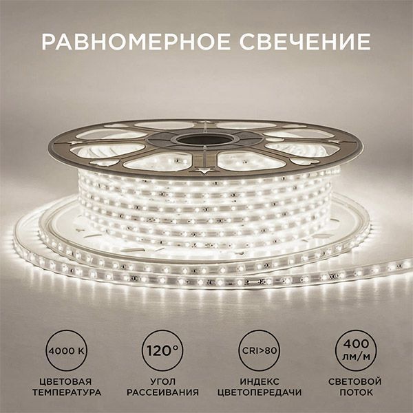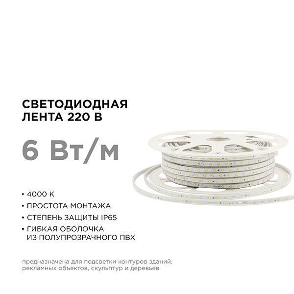 Светодиодная лента 220 В из линейки Стандарт с артикулом 17-43 используется для внутреннего и наружного декоративного освещения. Предназначена для подсветки рекламных конструкций, освещения торговых помещений, подсветки контуров зданий и витрин, создания световых фигур. Светодиодная лента помещена в ПВХ-оболочку с полупрозрачным рассеивателем и имеет размер 10х7 мм. Данная модель светодиодной ленты обладает дневным белым цветом свечения с цветовой температурой 4000 К. Длина изделия 50 м. Отрезать светодиодную ленту можно в специально отмеченных местах, которые располагаются через каждый 1 м. Степень защиты соответствует стандарту IP65, что позволяет использование не только во влажных помещениях, но и на улице. Подключение к сети 230 В осуществляется при помощи шнура питания с диодным мостом (приобретается отдельно).