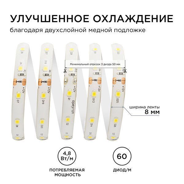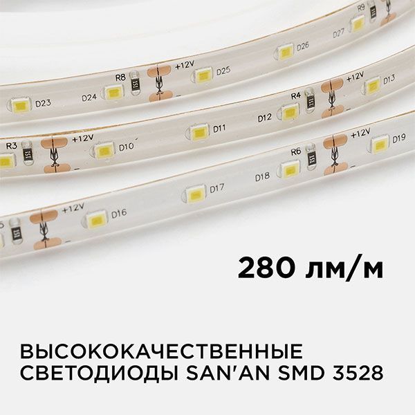 Светодиодная лента из линейки Стандарт с артикулом 00-147 работает от постоянного тока с напряжением 12В. Благодаря светодиодам smd 3528 излучающим световой поток равный 280 Лм/м лента является прекрасным решением, для воплощения в жизнь такого элемента оформления, как декоративная подсветка. Она подойдет для декорирования ниш в стенах, многоуровневых потолков и даже мебели. По сравнению с лампами накаливания светодиодная лента эквивалентна лампам мощностью 25 Вт. Данная модель светодиодной ленты обладает дневным белым цветом свечения с цветовой температурой 4000 К. При выборе светодиодной ленты важно учитывать такой параметр, как потребляемая мощность, чтобы правильно подобрать блок питания. У данной модели этот показатель равен 4,8 Вт на один метр. Степень защиты этого изделия соответствует стандарту IP65, что позволяет использование не только во влажных помещениях, но и на улице. Отрезать светодиодную ленту можно в специально отмеченных местах, которые располагаются через каждые 50 мм. Компактные размеры светодиодной ленты с шириной 8 мм и основанием из гибкой, двухслойной, медной подложки дают огромное преимущество при создании любых дизайнерских фантазий. Для управления лентой используйте диммер для монохромной светодиодной ленты (приобретается дополнительно). С помощью него можно включать или выключать светодиодную ленту, отрегулировать ее яркость, а также использовать различные динамические режимы и настроить скорость их работы.