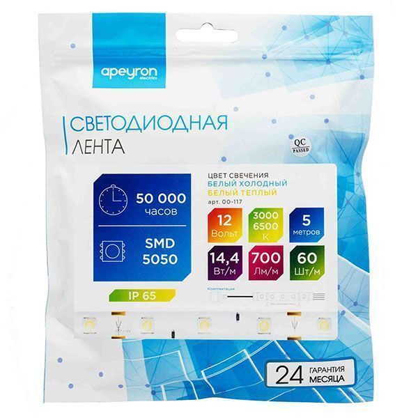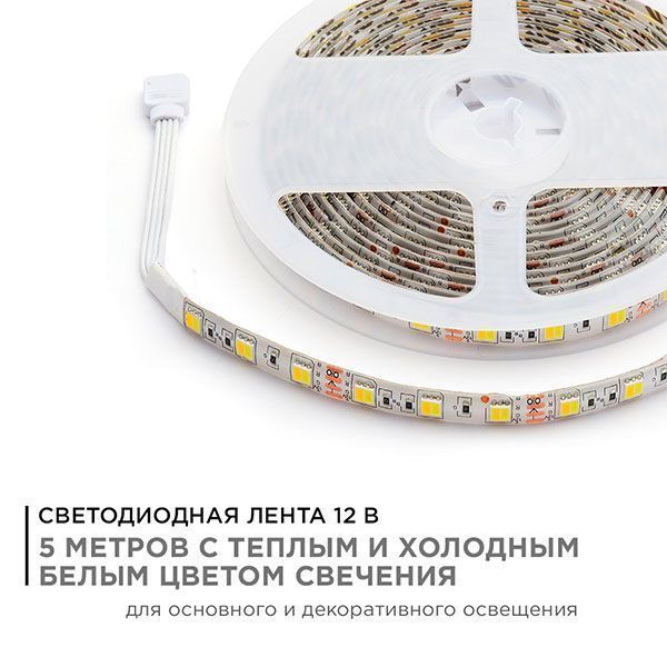 Светодиодная лента из линейки Стандарт с артикулом 00-117 работает от постоянного тока с напряжением 12В. Благодаря светодиодам smd 5050 излучающим световой поток равный 700 Лм/м лента является прекрасным решением для организации основного освещения и ярких декоративных подсветок. Она подойдет для создания основного освещения на базе многоуровневых потолков, а также будет отличным выбором для освещения торгового оборудования или требующих большой яркости рекламных вывесок. По сравнению с лампами накаливания светодиодная лента эквивалентна лампам мощностью 70 Вт. Данная модель светодиодной ленты является двухцветной. Каждый светодиод такой ленты имеет 2 базовых цвета: холодный белый с цветовой температурой 6400 К и теплый белый с цветовой температурой 3000 К. Благодаря такой модификации можно получить любой оттенок свечения белого цвета по желанию: от холодного белого до теплого белого, включая такой промежуточный цвет свечения, как дневной белый с цветовой температурой 4000 К. При выборе светодиодной ленты важно учитывать такой параметр, как потребляемая мощность, чтобы правильно подобрать блок питания. У данной модели этот показатель равен 14,4 Вт на один метр. Степень защиты этого изделия соответствует стандарту IP65, что позволяет использование не только во влажных помещениях, но и на улице. Отрезать светодиодную ленту можно в специально отмеченных местах, которые располагаются через каждые 50 мм. Компактные размеры светодиодной ленты с шириной 10 мм и основанием из гибкой, двухслойной, медной подложки дают огромное преимущество при создании любых дизайнерских фантазий.