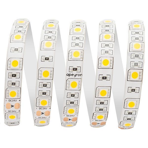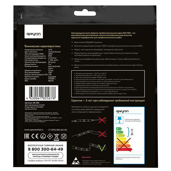 Светодиодная лента из линейки PRO с артикулом 00-320 работает от постоянного тока с напряжением 24В. Благодаря светодиодам smd 5050 излучающим световой поток равный 1100 Лм/м лента является прекрасным решением для организации основного освещения и ярких декоративных подсветок. Она подойдет для создания основного освещения на базе многоуровневых потолков, а также будет отличным выбором для освещения торгового оборудования или требующих большой яркости рекламных вывесок. По сравнению с лампами накаливания светодиодная лента эквивалентна лампам мощностью 110 Вт. Данная модель светодиодной ленты обладает теплым белым цветом свечения с цветовой температурой 3000 К. При выборе светодиодной ленты важно учитывать такой параметр, как потребляемая мощность, чтобы правильно подобрать блок питания. У данной модели этот показатель равен 14,4 Вт на один метр. Степень защиты этого изделия соответствует стандарту IP65, что позволяет использование не только во влажных помещениях, но и на улице. Отрезать светодиодную ленту можно в специально отмеченных местах, которые располагаются через каждые 100 мм. Компактные размеры светодиодной ленты с шириной 10 мм и основанием из гибкой, двухслойной, медной подложки дают огромное преимущество при создании любых дизайнерских фантазий. Для управления лентой используйте диммер для монохромной светодиодной ленты (приобретается дополнительно). С помощью него можно включать или выключать светодиодную ленту, отрегулировать ее яркость, а также использовать различные динамические режимы и настроить скорость их работы.