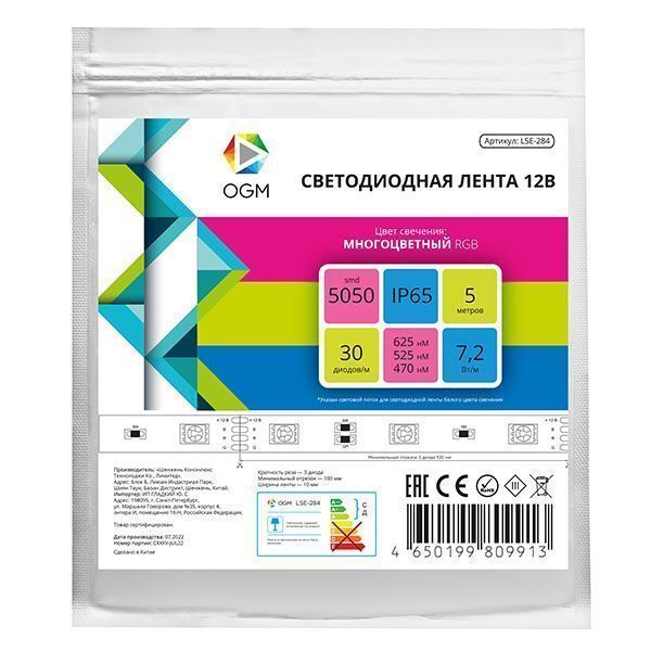 Светодиодная лента из линейки "Эконом" с артикулом LSE-284 работает от постоянного тока с напряжением 12В. Благодаря светодиодам smd5050, излучающим световой поток равный 7 Лм/чип*, лента является прекрасным решением, для воплощения в жизнь такого элемента оформления, как декоративная подсветка. Она подойдет для декорирования ниш в стенах, многоуровневых потолков и даже мебели. Данная модель светодиодной ленты является многоцветной. Каждый светодиод такой ленты имеет 3 базовых цвета: синий, зеленый и красный. В зависимости от используемого контроллера можно получить до 256 различных оттенков свечения. При выборе светодиодной ленты важно учитывать такой параметр, как потребляемая мощность, чтобы правильно подобрать блок питания. У данной модели этот показатель равен 7,2 Вт на один метр. Степень защиты этого изделия соответствует стандарту IP65, что позволяет использование не только во влажных помещениях, но и на улице. Отрезать светодиодную ленту можно в специально отмеченных местах, которые располагаются через каждые 100 мм. Компактные размеры светодиодной ленты с шириной 10 мм и основанием из гибкой, двухслойной, медной подложки дают огромное преимущество при создании любых дизайнерских фантазий.