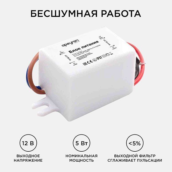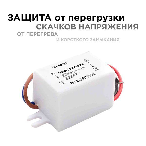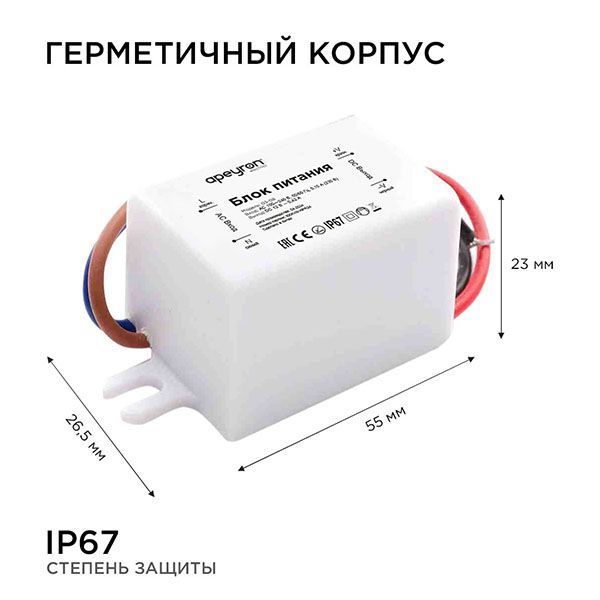 Блок питания 12В 03-08 из линейки Стандарт с номинальной мощностью 5Вт обладает на выходе постоянным током с напряжением 12В, что делает его идеальным источником питания для таких изделий, как светодиодная лента, светодиодные лампы, линейки и модули с рабочим напряжением 12В. Компактный пластиковый корпус с размерами 55х26,5х23мм позволит найти место для монтажа в любом интерьере, спрятать в местах с ограниченным пространством. Также он будет легок в подключении благодаря проводам с цветовой маркировкой и обозначениям на корпусе. Кроме всего прочего этот блок питания, благодаря входному фильтру, будет работать при скачках напряжения в диапазоне 170-264В, в то время как выходной фильтр сглаживает пульсацию и защищает ваши глаза. Данный блок питания имеет самую высокую степень защиты от пыли и влаги IP67. Такие блоки питания могут выдержать даже кратковременное погружение под воду, и именно их рекомендуется использовать в тех местах, где есть высокий уровень воздействия влаги и вероятность попадания воды.