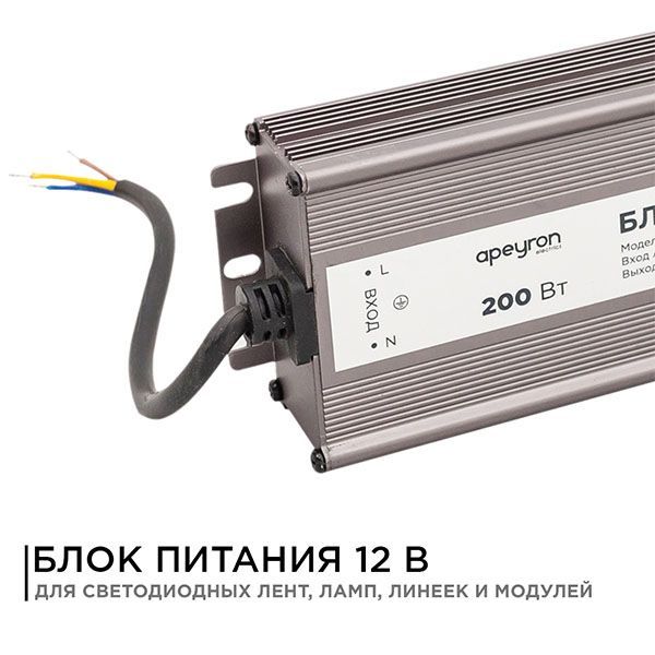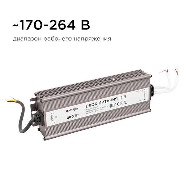 Блок питания 12В 03-107 из линейки Стандарт с номинальной мощностью 200Вт обладает на выходе постоянным током с напряжением 12В, что делает его идеальным источником питания для таких изделий, как светодиодная лента, светодиодные лампы, линейки и модули с рабочим напряжением 12В. Компактный, алюминиевый корпус с размерами 215х68х40мм позволит найти место для монтажа в любом интерьере, спрятать в местах с ограниченным пространством. Также он будет легок в подключении благодаря проводам с цветовой маркировкой и обозначениям на корпусе. Кроме всего прочего этот блок питания, благодаря входному фильтру, будет работать при скачках напряжения в диапазоне 170-264В, в то время как выходной фильтр сглаживает пульсацию и защищает ваши глаза. Данный блок питания имеет самую высокую степень защиты от пыли и влаги IP67. Такие блоки питания могут выдержать даже кратковременное погружение под воду, и именно их рекомендуется использовать в тех местах, где есть высокий уровень воздействия влаги и вероятность попадания воды.
