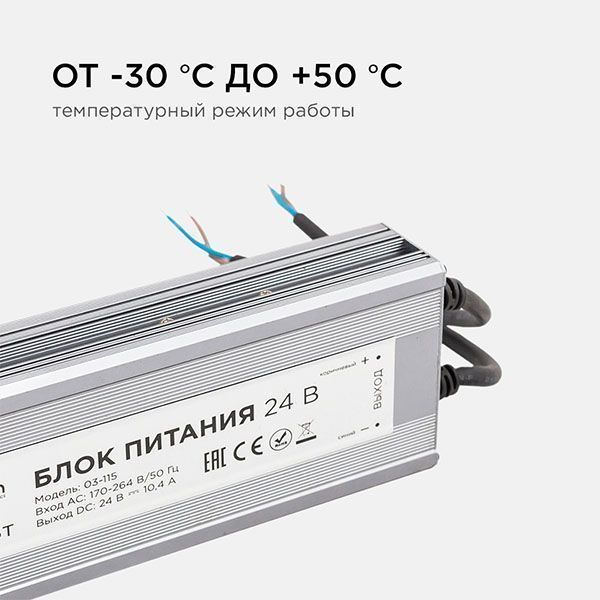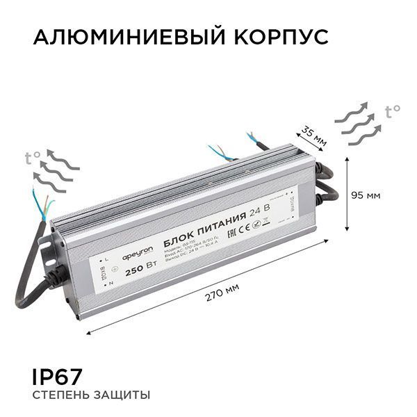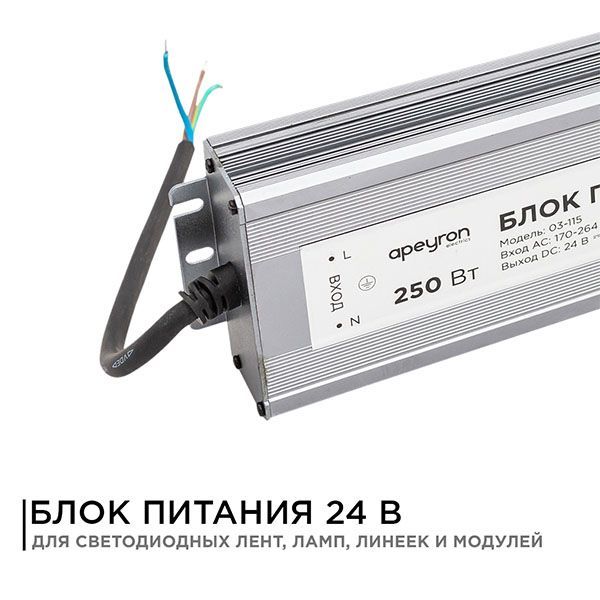Блок питания 24В 03-115 из линейки Стандарт с номинальной мощностью 250Вт обладает на выходе постоянным током с напряжением 24В, что делает его идеальным источником питания для таких изделий, как светодиодная лента, светодиодные лампы, линейки и модули с рабочим напряжением 24В. Компактный, алюминиевый корпус с размерами 270х95х35мм позволит найти место для монтажа в любом интерьере, спрятать в местах с ограниченным пространством. Также он будет легок в подключении благодаря проводам с цветовой маркировкой и обозначениям на корпусе. Кроме всего прочего этот блок питания, благодаря входному фильтру, будет работать при скачках напряжения в диапазоне 175-265В, в то время как выходной фильтр сглаживает пульсацию и защищает ваши глаза. Данный блок питания имеет самую высокую степень защиты от пыли и влаги IP67. Такие блоки питания могут выдержать даже кратковременное погружение под воду, и именно их рекомендуется использовать в тех местах, где есть высокий уровень воздействия влаги и вероятность попадания воды.