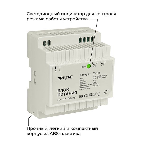 Блок питания (AC-DC) 12V 60W 03-161 Apeyron на din рейку