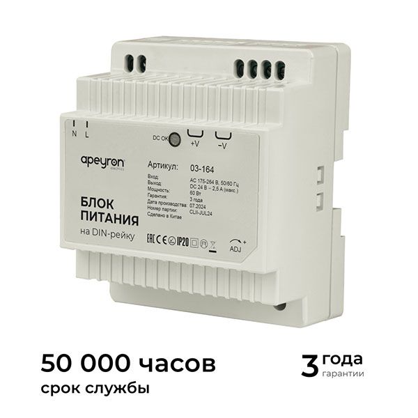 Блок питания (AC-DC) 24V 60W 03-164 Apeyron на din рейку