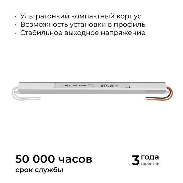 Компактный, ультратонкий алюминиевый корпус с размерами 312х18х18 мм позволяет устанавливать блок в ограниченном пространстве, а также встраивать в алюминиевый профиль для создания линейного светильника на базе светодиодной ленты.