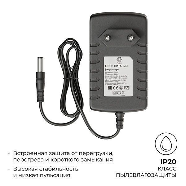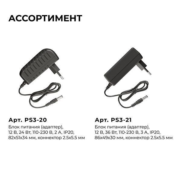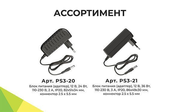 Блок питания (адаптер) 12 В с артикулом PS3-20 предназначен для подключения светодиодных лент, ламп, линеек и модулей с рабочим напряжением 12 В. Отлично подходит в тех случаях, когда нужно наиболее простое решение для организации подсветки или когда нет возможности прятать блок питания и его необходимо подключить к обычной розетке. Номинальная мощность 24 Вт. У блока питания в комплекте есть вилка и коннектор «папа» стандарта 2,5х5,5 мм для подключения источника свечения. Длина провода 900 мм. Корпус черного цвета выполнен из пластика, размер 82х51х34 мм. Адаптер, благодаря входному фильтру, будет работать при скачках напряжения в диапазоне 110-230 В, в то время как выходной фильтр сглаживает пульсацию, защищая глаза. Степень защиты от пыли и влаги IP20, это значит, что адаптер рекомендуется устанавливать в сухих и проветриваемых помещениях.
