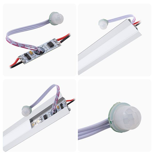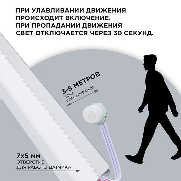 Выключатель с ИК датчиком движения на проводе 04-47 предназначен для управления светодиодной монохромной лентой 12/24 В. Выключатель устанавливается в алюминиевый профиль, в экране которого необходимо сделать отверстие размером 7х5 мм для работы датчика. При улавливании движения происходит включение и выключение света. При пропадании движения свет отключается через 30 секунд. Одно из преимуществ данного изделия заключается в возможности работать как от напряжения 12 В, так и 24 В, а значит его можно использовать со светодиодными лентами с соответствующим напряжением. Важно отметить, что в зависимости от того с каким напряжением предстоит работать устройству, будет отличаться и максимальная мощность нагрузки, которую можно подключить к нему. Так, при напряжении 12 В максимальная нагрузка будет равна 60 Вт, а при напряжении 24 В уже 120 Вт. Это значит, что к данному изделию вы можете подключить в два раза больше светодиодной ленты 24 В. Встраиваемый выключатель имеет размеры 38х10х6,2 мм. Степень защиты от пыли и влаги соответствует стандарту IP20, что подразумевает установку устройства в сухом, проветриваемом помещении.