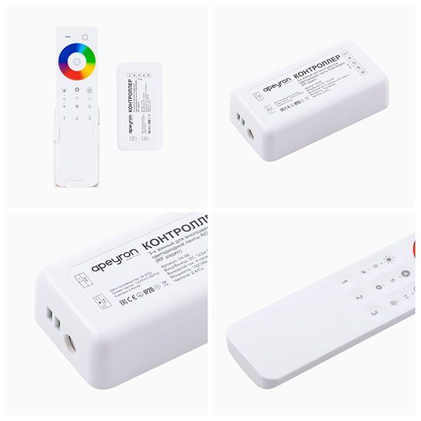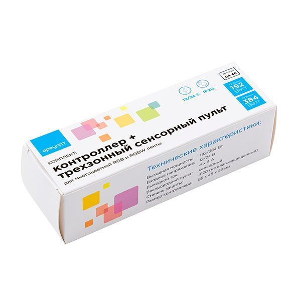 Трехзонный контроллер RGB-RGBW 04-48 предназначен для управления многоцветной светодиодной лентой RGB и RGBW 12/24 В. К 1 пульту управления можно подключить до 3-х контроллеров арт. 04-49 и управлять ими по отдельности, создавая нескольких зон освещения с уникальной световой и цветовой сценой для каждого помещения. С помощью контроллера можно регулировать цветовые оттенки, включать или выключать светодиодную ленту, выбирать различные динамические режимы свечения светодиодной ленты, регулировать яркость, а также подобрать комфортную скорость смены цветов в динамических режимах. Одно из преимуществ данного изделия заключается в возможности работать как от напряжения 12 В, так и 24 В, а значит его можно использовать со светодиодными лентами с соответствующим напряжением. Важно отметить, что в зависимости от того с каким напряжением предстоит работать устройству, будет отличаться и максимальная мощность нагрузки, которую можно подключить к нему. Так, при напряжении 12 В максимальная нагрузка будет равна 192 Вт, а при напряжении 24 В уже 384 Вт. Это значит, что к данному изделию вы можете подключить в два раза больше светодиодной ленты 24 В. Контроллер укомплектован дистанционным пультом управления, передающим сигнал по радиоканалу, благодаря чему сам контроллер можно спрятать из зоны видимости, и он будет также качественно принимать сигнал от пульта и управлять светодиодной лентой. Управление происходит с помощью стильной сенсорной панели, расположенной на лицевой стороне пульта, который работает от 2-х батареек ААА (приобретаются отдельно). Накладной корпус контроллера, выполненный из пластика, имеет компактный размер 85х45х23 мм, благодаря чему изделие можно разместить в узкой нише. Степень защиты от пыли и влаги соответствует стандарту IP20, что подразумевает установку устройства в сухом, проветриваемом помещении.