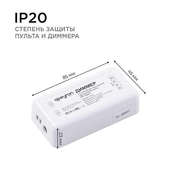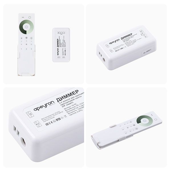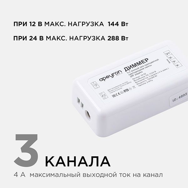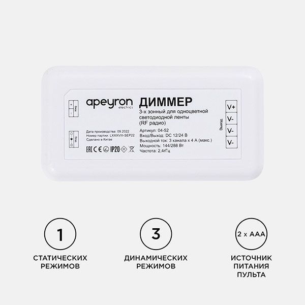 Комплект: диммер и трехзонный сенсорный пульт предназначен для управления монохромной светодиодной лентой 12/24 В. К 1 пульту управления можно подключить до 3-х диммеров арт. 04-53 и управлять ими по отдельности, создавая нескольких зон освещения с уникальной световой и цветовой сценой для каждого помещения. С помощью диммера можно включать или выключать светодиодную ленту, отрегулировать ее яркость, а также использовать различные динамические режимы и отрегулировать скорость их работы. Одно из преимуществ данного изделия заключается в возможности работать как от напряжения 12 В, так и 24 В, а значит его можно использовать со светодиодными лентами с соответствующим напряжением. Важно отметить, что в зависимости от того, с каким напряжением предстоит работать устройству, будет отличаться и максимальная мощность нагрузки, которую можно подключить к нему. Так, при напряжении 12 В максимальная нагрузка будет равна 144 Вт, а при напряжении 24 В уже 288 Вт. Это значит, что к данному изделию вы можете подключить в два раза больше светодиодной ленты 24 В. Диммер укомплектован дистанционным пультом управления, передающим сигнал по радиоканалу, благодаря чему сам контроллер можно спрятать из зоны видимости, и он будет также качественно принимать сигнал от пульта и управлять светодиодной лентой. Управление происходит с помощью стильной сенсорной панели, расположенной на лицевой стороне пульта, который работает от 2-х батареек ААА (приобретаются отдельно). Накладной корпус диммера, выполненный из пластика, имеет компактный размер 85х45х23 мм, благодаря чему изделие можно разместить в узкой нише. Степень защиты от пыли и влаги соответствует стандарту IP20, что подразумевает установку устройства в сухом, проветриваемом помещении.