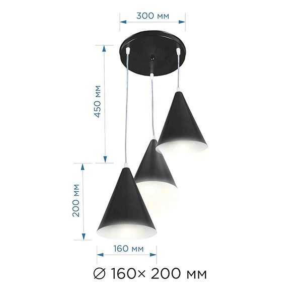 Подвесной декоративный светильник "Ляфамий" 14-44 используется как основной источник освещения для дома или любого пространства, где требуется подчеркнуть оригинальность интерьера. Идеально подойдет для кухни, гостиной, спальни, а также отлично будет смотреться в фотостудии, офисе, кафе и ресторане. Каждый металлический плафон черного цвета имеет размеры O160х200 мм. Длина прозрачного шнура 450 мм, регулируется при монтаже в зависимости от высоты потолков. Диаметр основания O300 мм. Тип крепления – подвесной, на планку. В светильник можно установить лампу накаливания или люминесцентную лампу с патроном Е14 мощностью до 40 Вт (в комплект не входит). Для низкого энергопотребления мы рекомендуем использовать светодиодную лампочку. Изделие предназначено для работы в сети с номинальным напряжением 220В. Степень защиты от пыли и влаги IP20.