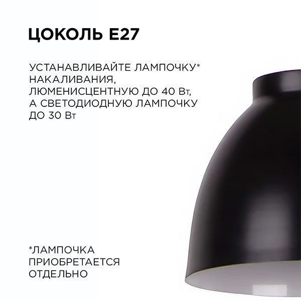 - Подойдёт лампа любого типа с цоколем E27 с максимальной мощностью до 40 Вт.