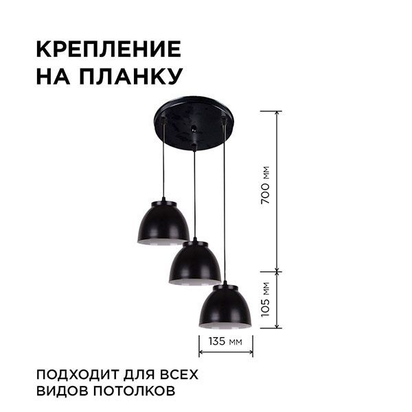 Подвесной декоративный светильник 16-65 используется как основной источник освещения для дома или любого пространства, где требуется подчеркнуть оригинальность интерьера. Стильный минималистичный дизайн светильника позволяет использовать его практически в любом помещении в современном стиле. Идеально подойдет для кухни, гостиной, спальни, а также отлично будет смотреться в фотостудии, офисе, кафе и ресторане. Металлический черный корпус имеет размер в сборе 340х700х340 мм. Длина черного шнура 700 мм, регулируется при монтаже в зависимости от высоты потолков. Тип крепления – подвесной, на планку. В светильник можно установить лампу накаливания или люминесцентную лампу с патроном Е27 мощностью до 40 Вт (лампочки в комплект не входят). Для низкого энергопотребления мы рекомендуем использовать светодиодную лампочку. Светильник предназначен для работы в сети с номинальным напряжением 230 В. Степень защиты от пыли и влаги IP20.
