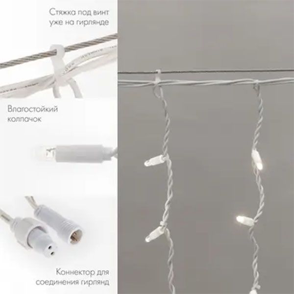 Данная гирлянда имеет белый цвет свечения и предназначена для использования как внутри помещений, так и снаружи.