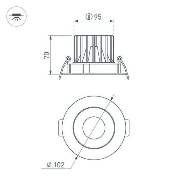 Встраиваемый поворотный светильник даунлайт. Мощность 12 Вт,св. поток 913 лм, 70 лм/Вт, дневной 4000 K, CRI>90, UGR<16, угол 32°, напряжение питания 230 В. Белый круглый корпус из алюминия, черный МАТОВЫЙ отражатель из PMMA, степень защиты IP20. Размер: диаметр 102 мм, высота 70 мм. Монтаж встраиваемый, установочное отверстие: диаметр 95 мм. Драйвер 20-40 В, 300 мА, пульсация <2%.