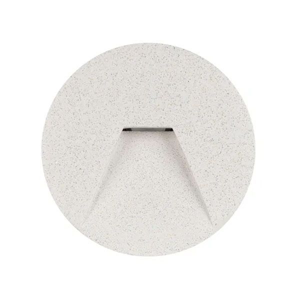 Светодиодный встраиваемый круглый светильник для стен, лестниц. Мощность 3Вт, световой поток 80 лм, теплый 3000К, угол 75x30°, CRI>80, напряжение 230 В. Круглый корпус из бетона белого цвета и алюминия. Степень защиты IP65. Питание AC230V, мощность 3Вт. Размеры DxH 120x76мм. Драйвер встроенный, пульсация <0.5%.
