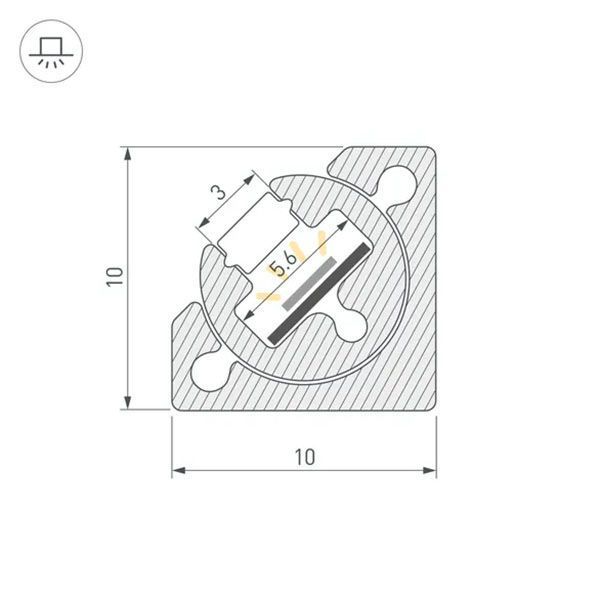 Двухкомпонентный накладной угловой профиль серо-стального цвета из алюминия в комплекте с матовым экраном из ПММА со светопропусканием 68% для подсветки мебели, пазов, ниш и других элементов интерьера. Вращающаяся внутренняя вставка позволяет менять направление света, не меняя локацию светильника. Габаритные размеры профиля составляют 2000 мм в длину, 10 мм в ширину и 10 мм в высоту. Площадка для установки светодиодных лент позволяет использовать ленту шириной до 5,6 мм и мощностью до 10 Вт/м.