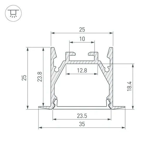 Встраиваемый профиль с накладным фланцем из анодированного алюминия для основной и контурной подсветки помещений. Габаритные размеры профиля составляют 2000 мм в длину, 35 мм в ширину и 25 мм в высоту, паз для установки 25 мм. Площадка для установки светодиодных лент позволяет использовать ленту шириной до 12,8 мм и мощностью до 27 Вт/м. Это обеспечивает гибкость в выборе светодиодных лент и создает потрясающие световые решения.