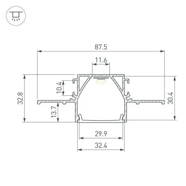Встраиваемый профиль из анодированного алюминия со скрытым фланцем для установки в гипсокартон толщиной 12,5 мм для основной и контурной подсветки помещений. Габаритные размеры профиля составляют 2000 мм в длину, 87,5 мм в ширину и 32,8 мм в высоту. Площадка для установки светодиодных лент позволяет использовать ленту шириной до 11 мм и мощностью до 35,7 Вт/м. Это обеспечивает гибкость в выборе светодиодных лент и создает потрясающие световые решения.