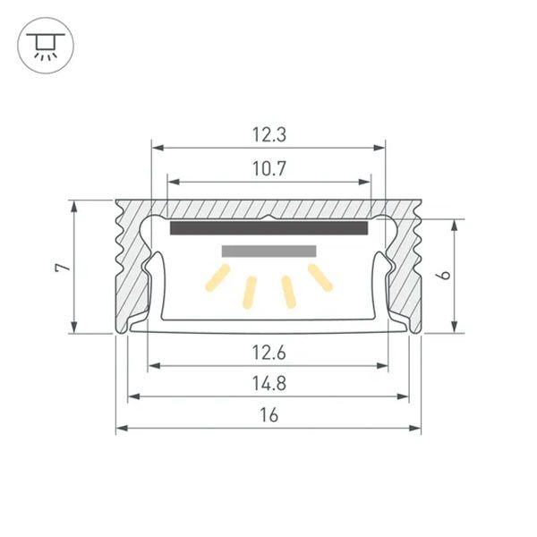 Алюминиевый анодированный профиль для светодиодных лент и линеек. Габаритные размеры (L?W?H): 2000x16x7 мм. Ширина площадки для ленты 10,7 мм. Экраны, заглушки и другие аксессуары приобретаются отдельно. Цена за 1 метр.