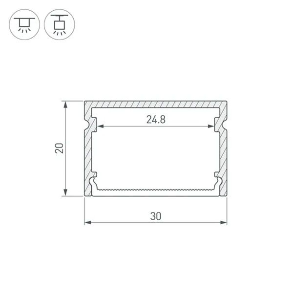 Алюминиевый анодированный накладной профиль для светодиодных лент и линеек. Габаритные размеры (L?W?H): 3000x30x20 мм. Ширина площадки для ленты 24,8 мм. Экраны, заглушки и другие аксессуары приобретаются отдельно. Цена за 1 метр.