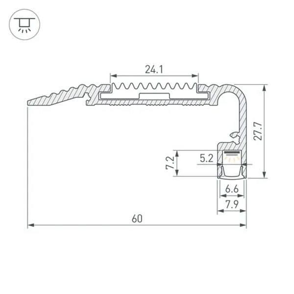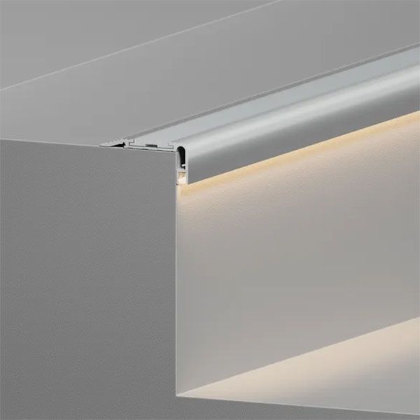 Алюминиевый анодированный накладной профиль для ступеней серебристого цвета. Антискользящая вставка идет в комплекте с профилем. Габаритные размеры (L?W?H): 2000x60x27,7 мм (накладная часть на ступеньку 52 мм). Ширина площадки для ленты 5,2 мм. Экраны и заглушки приобретаются отдельно. Цена за 1 м.