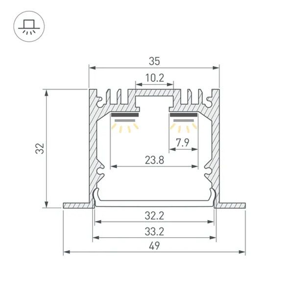 Алюминиевый анодированный профиль для светодиодных лент и линеек. Габаритные размеры (L?W?H): 2000x49x32 мм, паз для установки 35 мм. Ширина площадки для ленты 23,8 мм. Экраны, заглушки и другие аксессуары приобретаются отдельно. Цена за 1 метр.