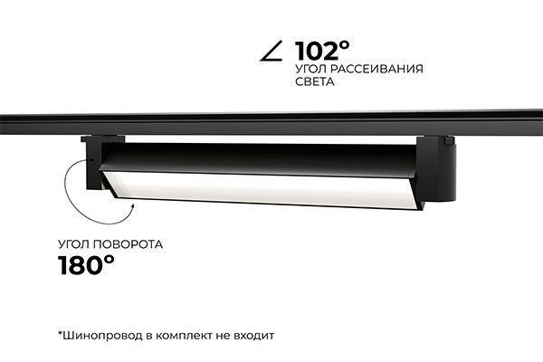 Светильник вращается на 180? по вертикальной оси, что позволяет регулировать направление светового луча. Конструкция изделия обеспечивает возможность перемещения светильника по шинопроводу, благодаря чему можно менять акценты освещения. Широкий угол рассеивания света 102°.