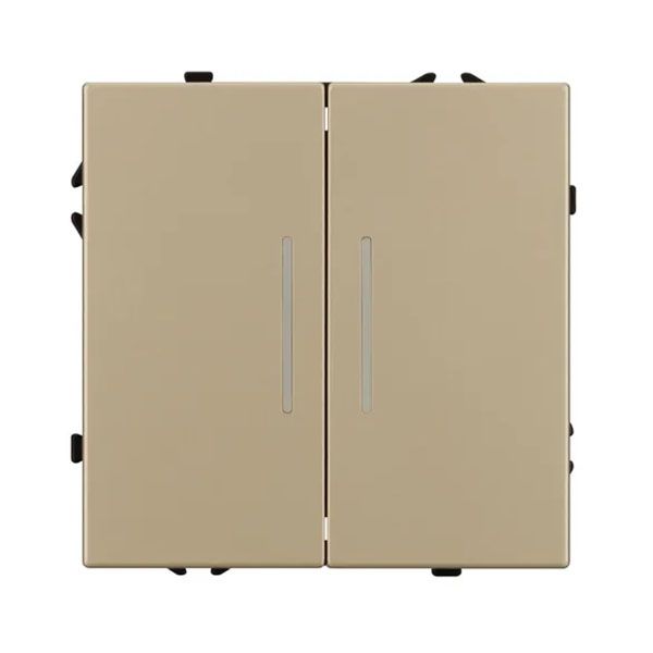 Механизм выключателя света клавишный на 1 пост 2 клавиши (проходной). Цвет - золотой песок, с Soft-Touch покрытием. Клавиша имеют активную LED подсветку - cинего свечения. Без фронтальной рамки. Уровень пылевлагозащиты IP20. Выключатель устанавливается в стандартный круглый подрозетник круглого сечения диаметром 60мм. Габаритные размеры: длина 71 мм, ширина 71 мм, высота 52 мм. Гарантийный срок 10 лет.